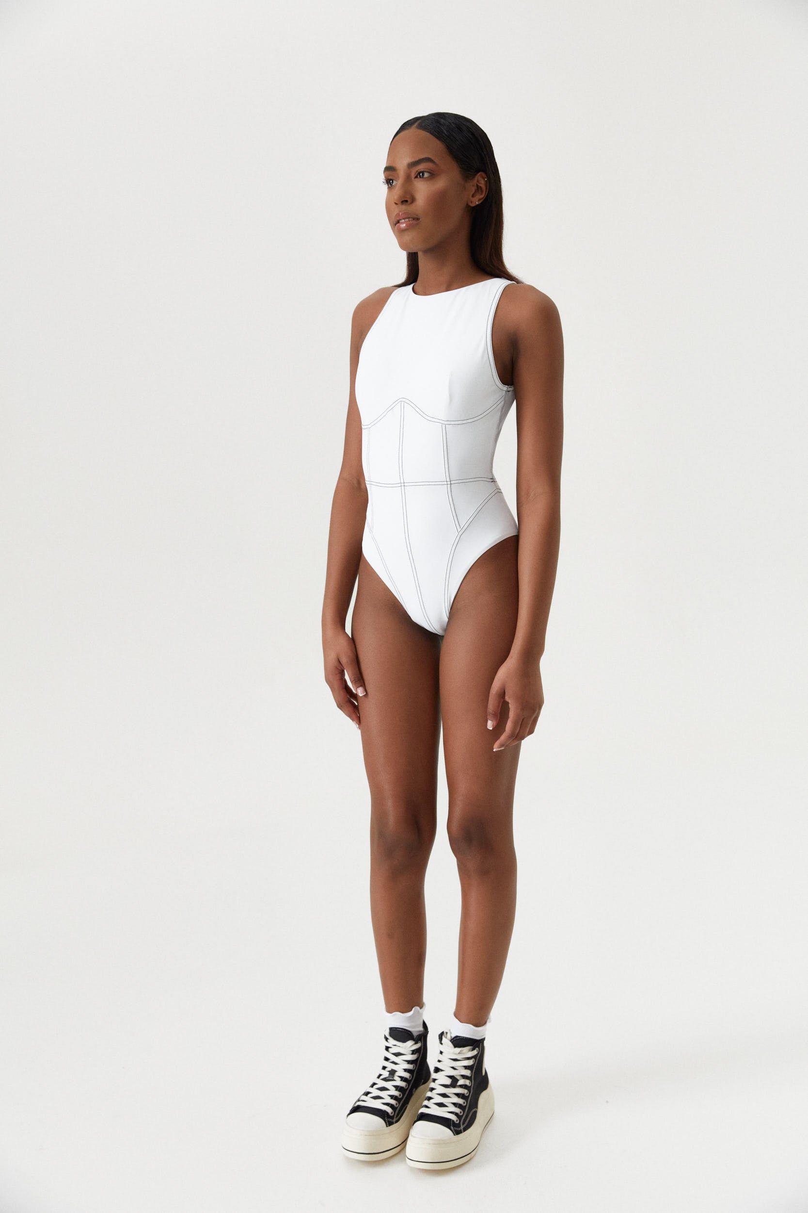 Costum de baie întreg cu spate decupat Corset Lines Alb