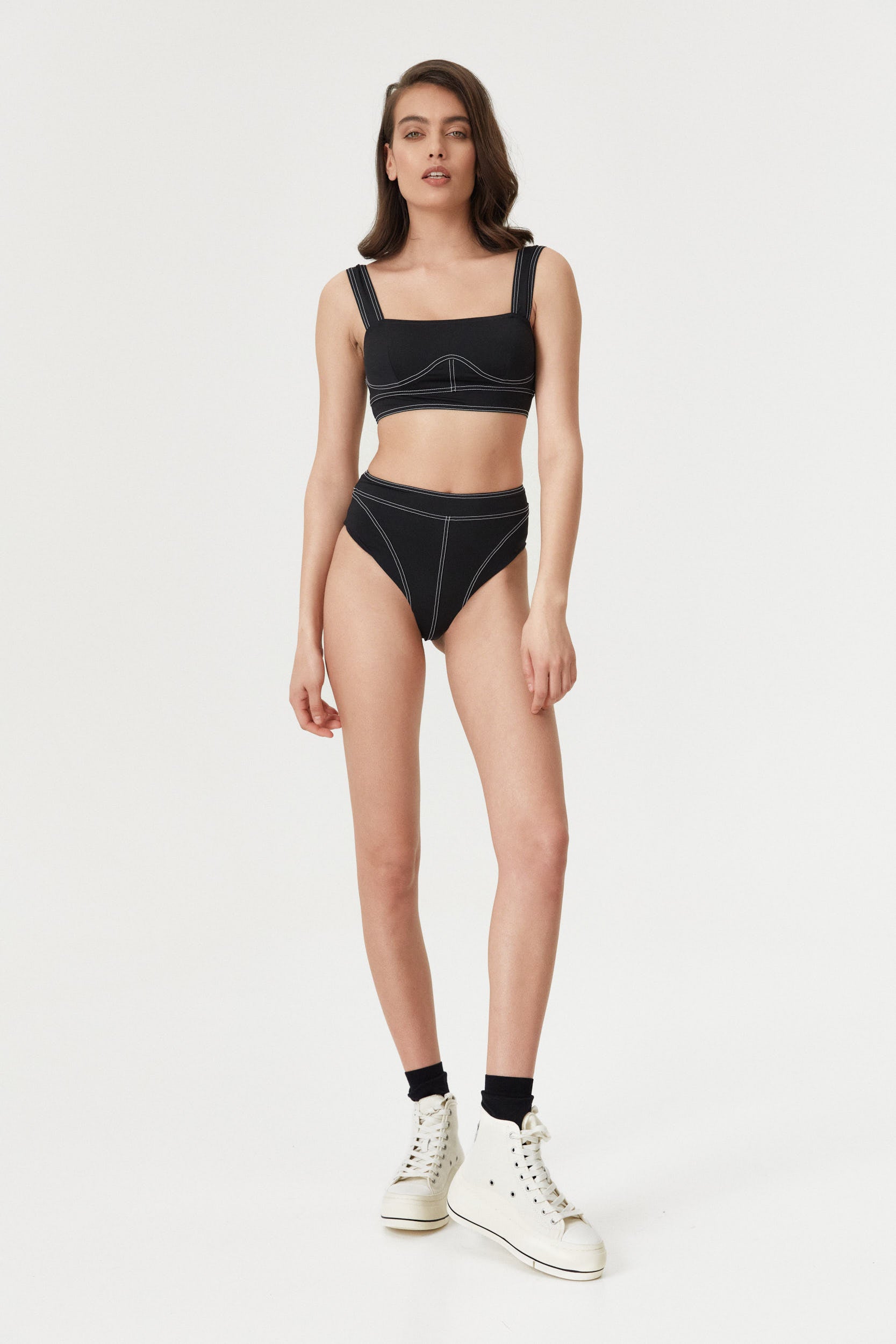Topul bikini corset negru este realizat dintr-un material mat, luxos, cu cusături albe contrastante, pentru un look elegant și rafinat. Designul crop, complet căptușit și fără burete, oferă o siluetă naturală și confort sporit. Un must-have versatil care îți ridică orice ținută